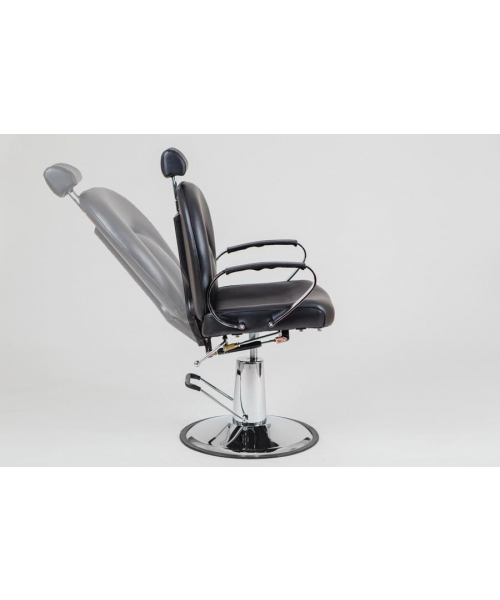 Если вы позиционируете свой салон как место премиум-класса, то обязательно обратите внимание на это мужское парикмахерское кресло. Стильное, мощное, с удобной подножкой — внимание! —на дополнительном роликовом колесе. Съемная подножка черного цвета с колесиком позволит поворачивать кресло вместе с клиентом. Эргономичная спинка интересного дизайна, небольшой подголовник, регулируемый по высоте, черная эко-кожа… всё, как любят мужчины! Крепкое хромированное основание и гидроподъемник завершают этот брутальный образ. А еще у этого кресла регулируется угол наклона спинки. Кто устал — может отдохнуть. Основание: хромированный круг. Подъёмник: гидравлический, хромированный.